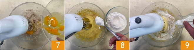 Fügen Sie langsam die Eier hinzu 7 und schlagen Sie etwa 1 Minute lang. Sieben Sie das Mehl und das Backpulver und fügen Sie sie nach und nach zur Mischung hinzu 8, während Sie weiter schlagen. Zuletzt geben Sie die Milch in die Schüssel 9 und schlagen, bis Sie einen homogenen Teig erhalten.