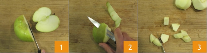 Um den Apfelkuchen mit 4 Getreidesorten zuzubereiten, schmelzen Sie zunächst die Butter und lassen Sie sie abkühlen. Waschen Sie die Äpfel und halbieren Sie sie 1, entfernen Sie das Kerngehäuse und die Schale 2 und schneiden Sie sie in Würfel von etwa 2 cm 3.