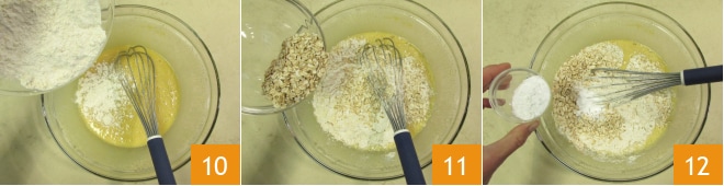 Gut mischen, dann die 3 Mehlsorten 10, die Haferflocken 11 und das Backpulver 12 hinzufügen.