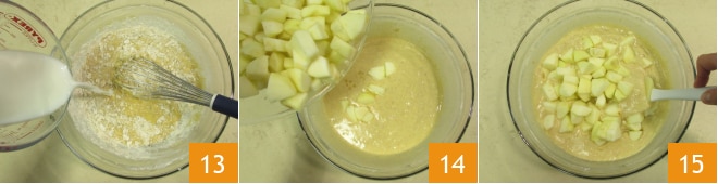 Nochmals mischen, dann die Milch 13 und die Äpfel mit dem gesamten Saft 14 hinzufügen und mit einem Spatel vermengen 15.