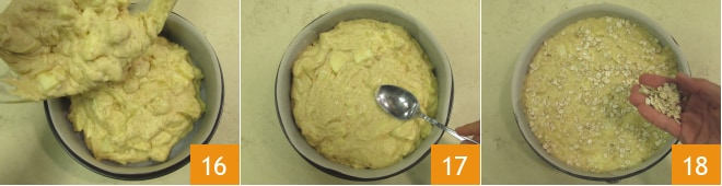 Legen Sie eine Springform mit einem Durchmesser von 24 cm mit Backpapier aus und gießen Sie den Teig hinein 16. Mit einem Löffel glätten 17 und die Oberfläche mit Haferflocken bestreuen 18.