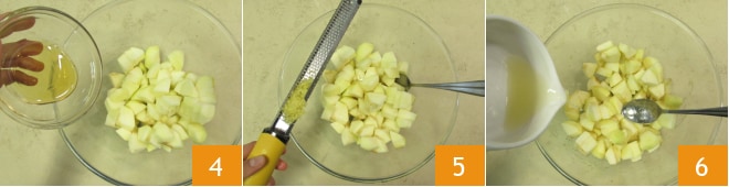 Geben Sie die Äpfel in eine Schüssel, fügen Sie den Honig 4, die abgeriebene Schale 5 und den Saft der Zitrone 6 hinzu. Gut mischen und beiseitestellen.
