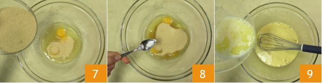 Nun geben Sie die Eier in eine andere Schüssel, fügen Sie den braunen Zucker 7 und das Salz 8 hinzu, schlagen Sie mit einem Handbesen und gießen Sie dann die geschmolzene Butter 9 hinzu.