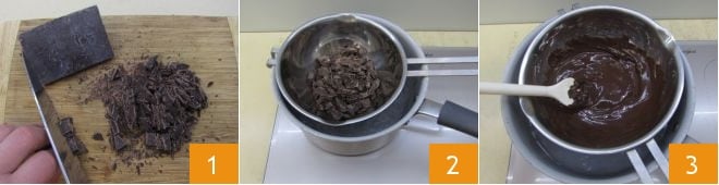 Um den Birnen-Schokoladen-Plumcake zuzubereiten, beginnen Sie damit, die Zartbitterschokolade grob mit einem Messer zu hacken 1, dann geben Sie sie in eine Schüssel, die in einem Topf mit Wasser steht, für das Wasserbad (das Wasser sollte den Boden des Topfes, in dem Sie die Schokolade eingefügt haben, berühren) 2. Schmelzen Sie die Schokolade bei mittlerer Hitze, bis sie eine dickflüssige Sauce wird 3, und lassen Sie sie dann abkühlen. In der Zwischenzeit fahren Sie mit der Zubereitung fort.