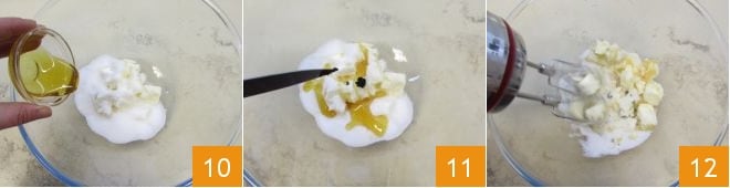 den Honig 10 und die aus der Vanilleschote extrahierten Samen 11. Schlagen Sie die Mischung mit einem Handmixer, bis sie hell und schaumig wird 12