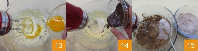 Dann fügen Sie auch die Eier hinzu und schlagen weiter mit dem Handmixer 13. Zum Schluss gießen Sie die zuvor geschmolzene Schokolade dazu 14. Nun geben Sie nach und nach die gesiebten pulverförmigen Zutaten löffelweise zur Mischung 15, ohne mit dem Handmixer aufzuhören.