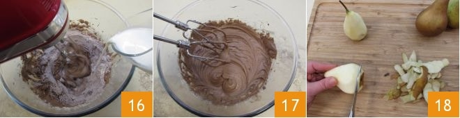 Zum Schluss gießen Sie die Milch bei Raumtemperatur langsam ein 16 und mischen weiter, bis Sie eine homogene Mischung erhalten 17. Schälen Sie die Birnen, wobei Sie darauf achten, den Stiel zu erhalten, und glätten Sie dann mit einem Messer den unteren Teil 18.