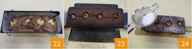bis sie vollständig bedeckt sind und nur die Stiele herausragen 22. Backen Sie den Kuchen in einem vorgeheizten statischen Ofen bei 170° für 75 Minuten. Wenn der Plumcake während des Backens zu dunkel wird, decken Sie ihn mit Aluminiumfolie ab und fahren Sie mit dem Backen fort. Am Ende der Backzeit holen Sie den Birnen-Schokoladen-Plumcake aus dem Ofen und lassen ihn abkühlen, dann formen Sie ihn ab 23 und bestäuben die Oberfläche mit Puderzucker 24. Der Birnen-Schokoladen-Plumcake ist bereit, um genossen zu werden!