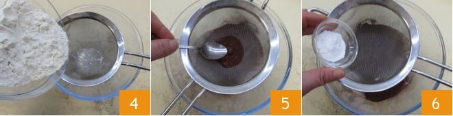 In einer Schüssel sieben Sie das Mehl Typ 00 4, den ungesüßten Kakao 5 und das Backpulver 6, indem Sie sich mit der Rückseite eines Teelöffels helfen.