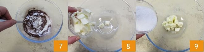 Mischen Sie die pulverförmigen Zutaten, um sie zu vermengen 7. In einer anderen Schüssel geben Sie die Stücke von weicher Butter 8, den Kristallzucker 9,