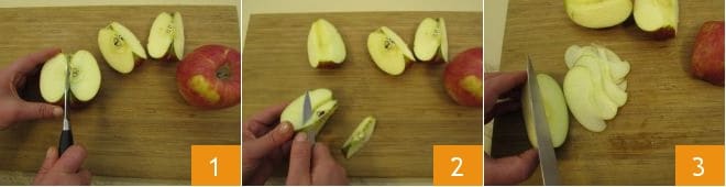 Um die Blätterteig- und Apfelröschen zuzubereiten, beginnen Sie damit, einen Topf voll Wasser auf den Herd zu stellen, dann reinigen Sie die Äpfel: Schneiden Sie sie in Spalten 1, entfernen Sie das Kerngehäuse mit einem Messer 2 oder dem entsprechenden Werkzeug. Schneiden Sie dann die Äpfel in sehr dünne Scheiben 3.