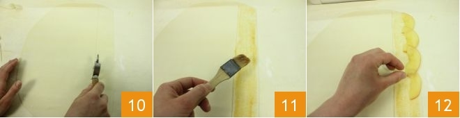 Verwenden Sie einen glatten Teigausstecher, um aus jedem Blatt 6 Streifen von etwa 5 cm Breite zu schneiden 10. Bestreichen Sie jeden Streifen mit Aprikosenmarmelade 11, tupfen Sie die Apfelscheiben mit einem Küchenpapier ab und legen Sie sie leicht überlappend entlang jedes Streifens: Die Seite mit der Schale sollte über einen der Ränder des Blätterteigstreifens hinausragen 12.