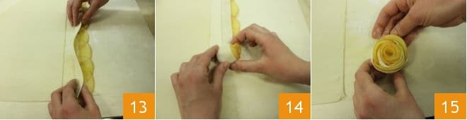 Jetzt falten Sie den verbleibenden Blätterteigstreifen über die Äpfel 13 und rollen ihn von einem der schmaleren Enden auf sich selbst auf 14; befestigen Sie das letzte Stück gut und Sie haben ein Röschen 15.