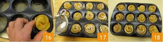 Legen Sie jedes Röschen in eines der Löcher der Form 16 und wenn Sie alle fertiggestellt haben, bestreuen Sie sie mit Puderzucker 17. Backen Sie im vorgeheizten statischen Ofen bei 170° für 45 Minuten. Sobald sie fertig gebacken sind, nehmen Sie die Blätterteig- und Apfelröschen aus dem Ofen 18 und formen Sie sie, bevor sie kalt sind, da der Zucker beim Abkühlen dazu neigt, zu festigen und sie schwer zu lösen sein könnten.