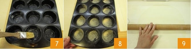 Jetzt fetten Sie eine Muffinform mit einem Pinsel und weicher Butter ein 7, dann bestreuen Sie jede Sektion mit braunem Zucker 8. Nehmen Sie den Blätterteig und rollen Sie ihn aus, um zwei Rechtecke zu erhalten 9.