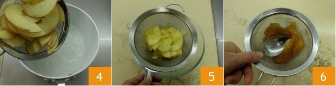 Wenn das Wasser den Siedepunkt erreicht hat, geben Sie die Äpfel hinein und lassen Sie sie 1 Minute kochen, bis sie weich, aber nicht zerfallen sind. Dann schalten Sie den Herd aus, lassen Sie sie abtropfen 5 und abkühlen. An diesem Punkt können Sie die Aprikosenmarmelade durch ein Sieb streichen, um sie cremiger zu machen (dieser Schritt ist optional) 6.