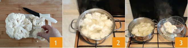 Um den Blumenkohlauflauf zuzubereiten, entfernen Sie die äußeren Blätter und den zentralen Strunk, dann trennen Sie die Röschen vorsichtig mit einem kleinen Messer ab. Kochen Sie die Röschen in kochendem Wasser 2. Nach 20 Minuten sind sie weich, das merken Sie mit den Zinken einer Gabel. Lassen Sie sie abtropfen und zerdrücken Sie sie noch heiß 3.