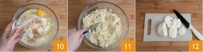 Die Muskatnuss 10 hinzufügen und alles gut mit einem Löffel vermengen 11. Schneiden Sie den Mozzarella in dünne Scheiben und legen Sie ihn beiseite 12.