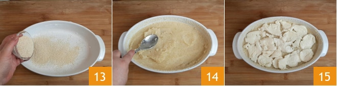 Fetten Sie eine Auflaufform mit Butter ein und bestreuen Sie das Innere mit Paniermehl 13. Geben Sie die Hälfte des Blumenkohl-Kartoffel-Pürees auf den Boden der Auflaufform und glätten Sie es mit der Rückseite eines Löffels 14, dann bedecken Sie die Oberfläche mit einem Teil des Mozzarellas 15.