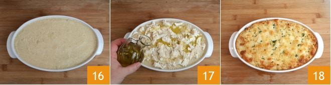 Beginnen Sie nun erneut, indem Sie den restlichen Teil des Pürees 16 hinzufügen, und glätten Sie es ebenfalls, und beenden Sie mit dem übrigen Mozzarella. Bestreuen Sie alles mit Paniermehl, geben Sie einen Schuss Öl dazu und können Sie mit dem Backen beginnen 17. Backen Sie den Blumenkohlauflauf bei 200 ° für etwa 25 Minuten im vorgeheizten statischen Ofen. Eine kurze Gratination am Ende der Backzeit, um die Oberfläche zu bräunen, und Sie können ihn endlich genießen: Servieren Sie ihn mit einem Hauch Petersilie 18.