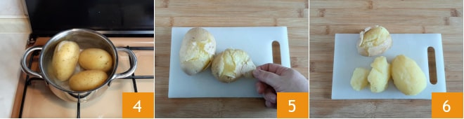 In der Zwischenzeit kochen Sie auch die Kartoffeln, indem Sie sie in einen großen Topf mit Wasser legen 4. Bringen Sie das Wasser zum Kochen und kochen Sie sie je nach Größe 30 bis 50 Minuten lang. Sobald sie fertig sind (machen Sie immer den Gabeltest), schälen Sie sie, solange sie noch sehr heiß sind 5: Auf diese Weise löst sich die Schale leicht 6.