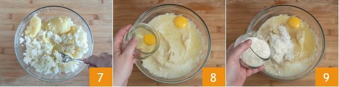 Zerdrücken Sie auch diese in der Schüssel mit dem Blumenkohl und erhalten Sie ein glattes Püree 7. Nun können Sie die Eier hinzufügen 9, mit Salz und Pfeffer abschmecken, den geriebenen Käse dazugeben 9.