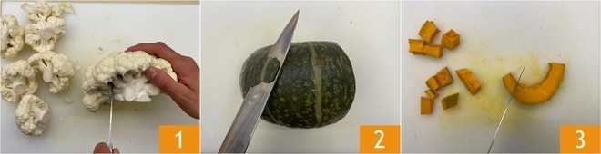 Um die Blumenkohl-Kurkuma-Suppe mit knusprigen Kichererbsen zuzubereiten, reinigt den Blumenkohl, indem ihr die Röschen abtrennt 1. Schneidet den Kürbis in Spalten, schält ihn 2, entfernt die Samen und die inneren Fasern und schneidet ihn dann in Würfel von etwa 2 cm 3.