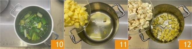 Lasst es zwanzig Minuten köcheln 10. In einem großen Topf erhitzt das Öl, fügt die Kartoffeln 11 und den Blumenkohl 12 hinzu und bratet sie etwa 5 Minuten an.