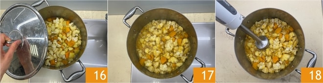 Deckt den Topf mit dem Deckel ab 16 und setzt das Kochen etwa 15 Minuten fort. Nach 15 Minuten nehmt den Deckel von den Gemüsen ab und lasst die Zubereitung austrocknen 17. Püriert das Gemüse mit einem Stabmixer 18.