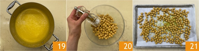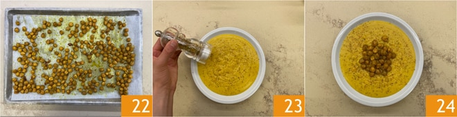 Ihr solltet eine glatte Creme erhalten 19. In der Zwischenzeit würzt in einer Schüssel die abgetropften Kichererbsen mit schwarzem Pfeffer, Kurkuma 20 und Salz. Verteilt sie auf einem mit Backpapier ausgelegten Blech 21, röstet sie im vorgeheizten Umluftofen bei 200 Grad für 20 Minuten.