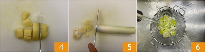 Schält die Kartoffeln und schneidet sie in Würfel von etwa 2 cm 4. Putzt die Lauchzwiebeln, behaltet den grünen Teil auf, dann schneidet sie in Scheiben 5, spült sie unter fließendem Wasser ab 3 und lasst sie abtropfen.