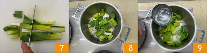 Schneidet den grünen Teil der Lauchzwiebeln in Stücke 7, spült sie ab, lasst sie in einem Topf mit wenig Öl einige Minuten anrösten 8, fügt 500 g Wasser hinzu 9.
