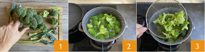 Um den Brokkoli-Wurst-Ring zuzubereiten, reinigen Sie zuerst den Brokkoli, indem Sie die Blätter entfernen und die Röschen vom Stiel trennen 1, spülen Sie sie dann unter fließendem Wasser ab und blanchieren Sie sie etwa 3 Minuten lang in gesalzenem Wasser 2. Dann abgießen und beiseitelegen 3.