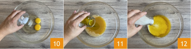 In einer Schüssel die Eier aufschlagen, Salz hinzufügen 10 und mischen. Dann das Öl 11 und die Milch 12 hinzufügen und erneut mischen.