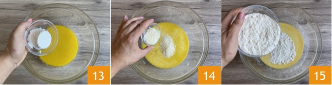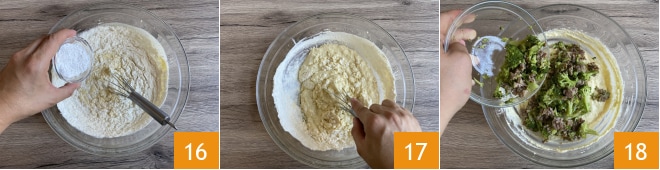 Fügen Sie den gut abgetropften Ricotta hinzu 13, dann den geriebenen Käse 14, mischen und das Mehl nach und nach unterheben 15.