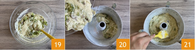 Vorsichtig in den Teig einarbeiten 19 und in eine gefettete und bemehlte 18 cm Kuchenform geben 20. Die Oberfläche mit einem Spatel glattstreichen 21.