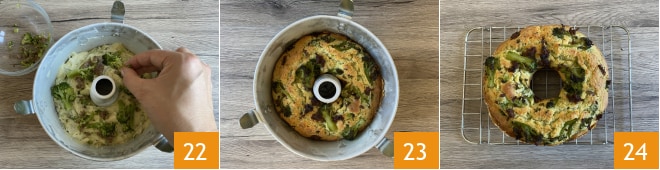 Die restliche Füllung oben drauf geben 22, bei 180° im vorgeheizten statischen Ofen etwa 35/40 Minuten backen. Aus dem Ofen nehmen 23 und auf ein Gitter zum Abkühlen legen, dann den Brokkoli-Wurst-Ring servieren.