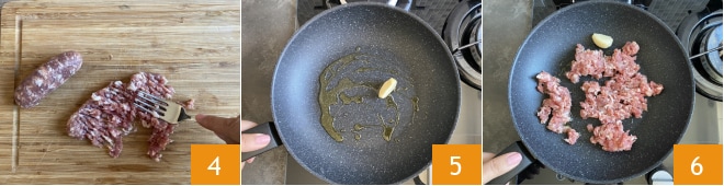 Entfernen Sie die Pelle von den Würstchen und zerdrücken Sie sie mit einer Gabel 4, dann geben Sie einen Schuss Öl und eine Knoblauchzehe in eine Pfanne 5, fügen Sie die Wurst hinzu und lassen Sie sie etwa 3 Minuten braten 6.