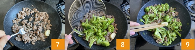 Wenn die Wurst gut angebraten ist 7, fügen Sie den Brokkoli hinzu 8, geben Sie ihn in die Pfanne zur Wurst, lassen Sie es 5 Minuten würzen, entfernen Sie die Knoblauchzehe 9, nehmen Sie es vom Herd und lassen Sie es abkühlen.