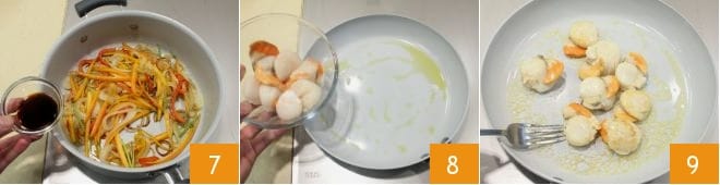 Fügen Sie schließlich die Sojasauce hinzu 7, lassen Sie sie verdampfen und schalten Sie die Hitze aus. In einer anderen Pfanne etwas Öl erhitzen und die Jakobsmuscheln ohne Schale anbraten 8. Braten Sie sie 3-4 Minuten bei starker Hitze an und wenden Sie sie mit einer Gabel 9.