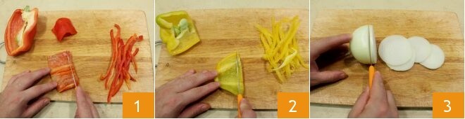 Um die Jakobsmuscheln auf einem Bett aus karamellisierten Zwiebeln mit Karotten und Paprika in Sojasauce zuzubereiten, beginnen Sie mit dem Gemüsebett: Nehmen Sie die roten und gelben Paprika, öffnen Sie sie und entfernen Sie die inneren Samen, dann schneiden Sie sie in möglichst gleich große Streifen (1-2). Schälen und schneiden Sie eine Zwiebel fein, auch hier möglichst in gleich große Scheiben 3.