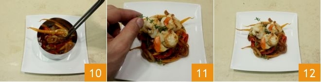 Richten Sie die Speisen nun nach Belieben an; zum Beispiel könnten Sie einen Servierring auf einen einzelnen Servierteller stellen und zuerst das Gemüse hineingeben 10, um eine Nestform zu schaffen, dann die Jakobsmuscheln darauf legen und mit einem Thymianzweig garnieren 11. Servieren Sie die Jakobsmuscheln heiß auf einem Bett aus karamellisierten Zwiebeln mit Karotten und Paprika in Sojasauce 12!