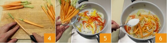 Schneiden Sie dann einen Teil des grünen Teils der Babykarotten ab, schälen Sie diese mit einem Sparschäler und halbieren Sie sie 4. In einer Pfanne das Öl erhitzen, dann die Zwiebeln, Paprika und Karotten dazugeben 5 und bei mittlerer Hitze 7-8 Minuten anbraten. Das Gemüse sollte knackig bleiben. Geben Sie dann den Zucker hinzu 6 und karamellisieren Sie es, indem Sie es gelegentlich mit einem Holzlöffel umrühren.