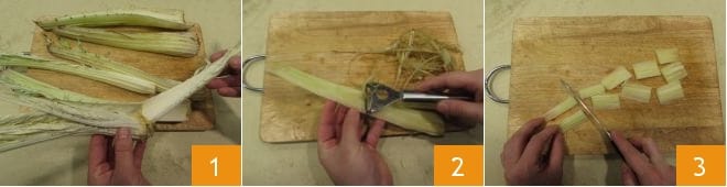 Um den Cardone aus Benevent zuzubereiten, beginnen Sie mit der Zubereitung der Hühnerbrühe (oder Hähnchen). In der Zwischenzeit reinigen Sie die Distel (Sorte Gobbo): Entfernen Sie die äußeren, harten Rippen 1 und bewahren Sie die inneren auf, die zart sind. Waschen Sie sie gründlich und entfernen Sie die Fasern mit einem Sparschäler 2. Schneiden Sie die Rippen in Stücke 3