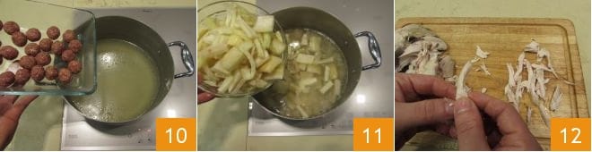 Nachdem Sie das Huhn abgetropft haben, kochen Sie die Fleischbällchen etwa 10 Minuten lang im Topf mit der Hühnerbrühe 10, dann fügen Sie die gut abgetropften Disteln hinzu und kochen Sie sie weitere 15-20 Minuten 11. Während die Fleischbällchen und die Disteln in der Brühe kochen, zerkleinern Sie das Huhn von Hand in kleine Streifen 12.