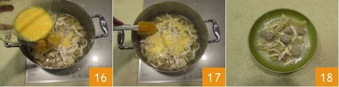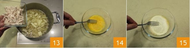Fügen Sie diese ebenfalls in die Brühe 13. Zum Schluss schlagen Sie die Eier in einer Schüssel auf 14 und mischen sie mit einer Prise Salz und dem geriebenen Parmesan 15.