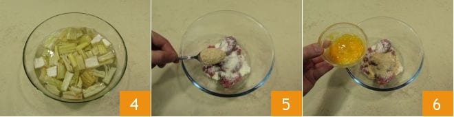 und tauchen Sie sie in kaltes Wasser mit Zitronensaft, um ein Anlaufen zu verhindern 4. In der Zwischenzeit kümmern Sie sich um die Fleischbällchen. In einer Schüssel mischen Sie das Hackfleisch, das Salz und den Pfeffer, den geriebenen Parmesan und die Semmelbrösel 5. Dann fügen Sie die leicht geschlagenen Eier hinzu 6