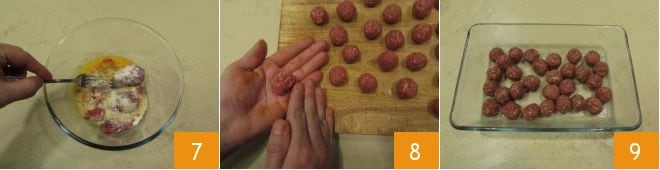 und mischen Sie alles gut durch 7, bis ein weicher, aber kompakter Teig entsteht. Formen Sie etwa 10 Gramm schwere Fleischbällchen 8 (so sollten Sie etwa 30 erhalten) und bewahren Sie sie im Kühlschrank in Frischhaltefolie auf, bis die Brühe fertig ist 9.