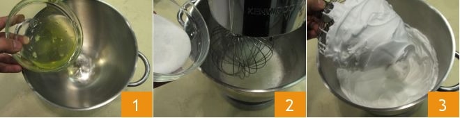 Um die Charlotte mit Mousse aus dunkler Schokolade zuzubereiten, beginnen Sie mit der Zubereitung der Löffelbiskuitbasis: Trennen Sie das Eigelb vom Eiweiß, gießen Sie das Eiweiß in die Schüssel einer Küchenmaschine mit Schneebesen 1, schalten Sie die Maschine ein und beginnen Sie mit dem Schlagen, fügen Sie auch nach und nach den Zucker hinzu 2 und schlagen Sie weiter, bis das Eiweiß weiß und glänzend ist 3,