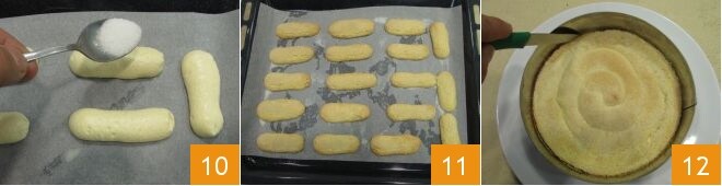 Bestreuen Sie auch die Oberfläche der Löffelbiskuits mit Zucker 10, backen Sie die Löffelbiskuits ebenfalls im vorgeheizten statischen Ofen bei 190°C für 10 Minuten (oder im Umluftofen bei 170°C für etwa 8 Minuten). Wenn das Backen abgeschlossen ist, nehmen Sie die Löffelbiskuits 11 und die Basis aus dem Ofen und lassen Sie sie abkühlen. Mit einem kleinen Messer den Rand der Basis vom Stahlring lösen, ohne ihn zu entfernen 12, er wird benötigt, um die Creme zu festigen.